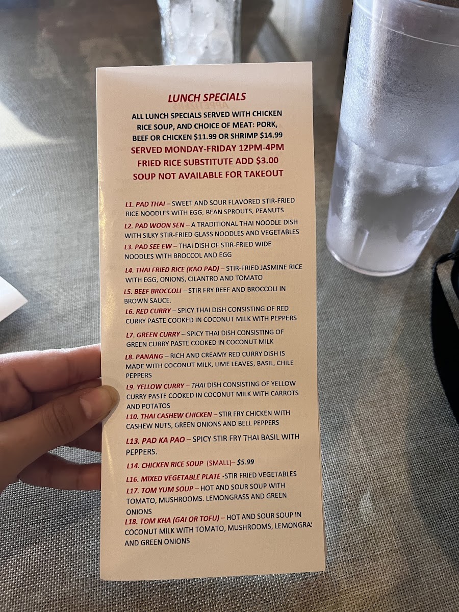 Explore a vibrant menu filled with favorites like pad wasoon, pad thai, and pumpkin curry, which is often described as sheer perfection. Their offerings extend from delightful Thai Cheese Rolls to comforting Drunken Noodles and Tom Yum soup, each expertly prepared with fresh ingredients tailored to your spice preferences. The cozy ambiance and attentive service enhance the experience, making every meal not just delicious but also memorable. Don’t miss out on their sweet mango sticky rice and refreshing coconut ice cream to round off your dining journey.
